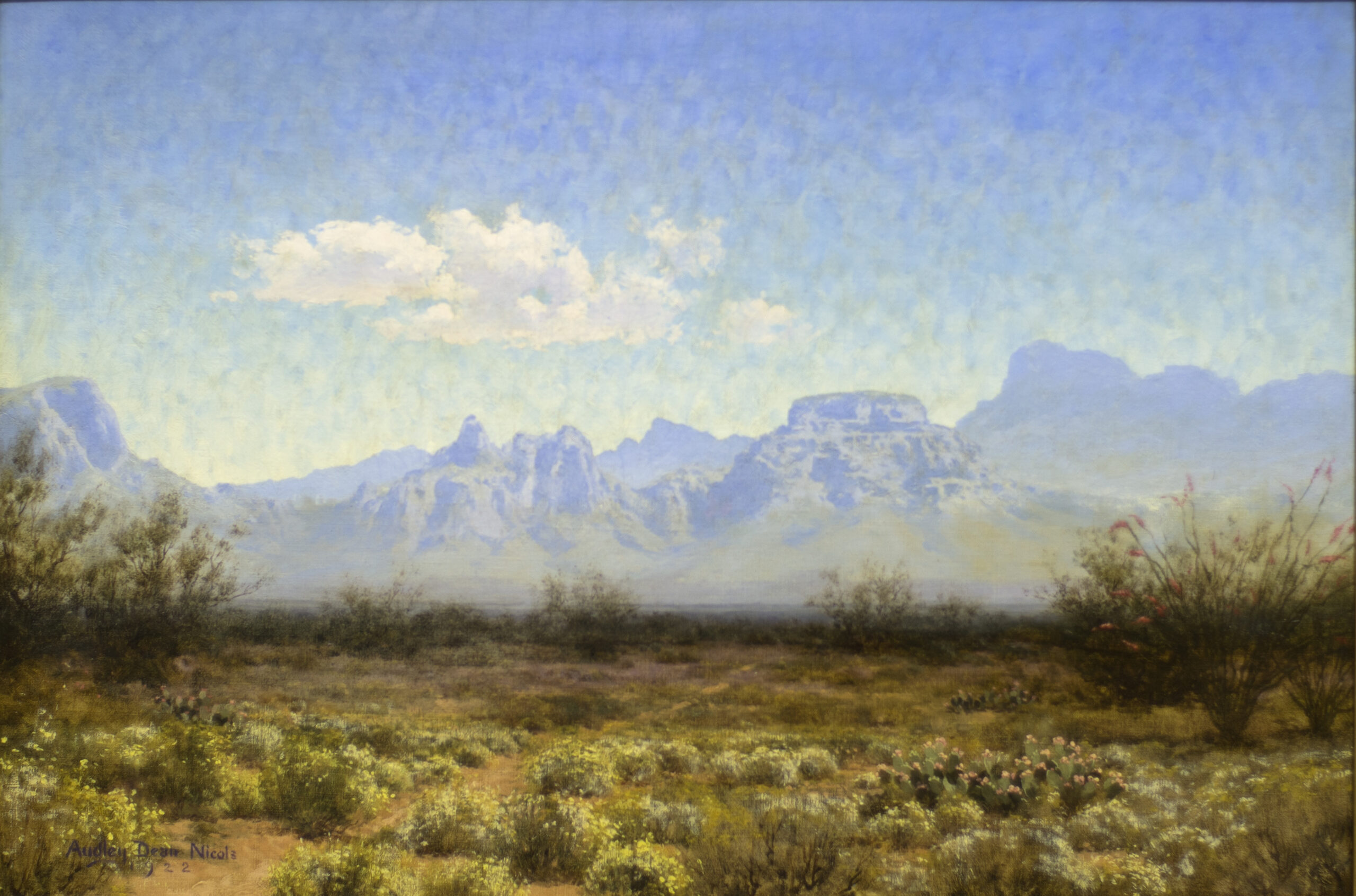 As it was for so many artists before him, the lure of the Southwest was powerful. Nicols traveled to the West in 1919, moving to El Paso, Texas, in the late 1920s. He established his career as a muralist and painter of the starkly dramatic linear vistas of West Texas, New Mexico, Arizona, and California, earning recognition for his renditions of cowboy life and its western landscapes.