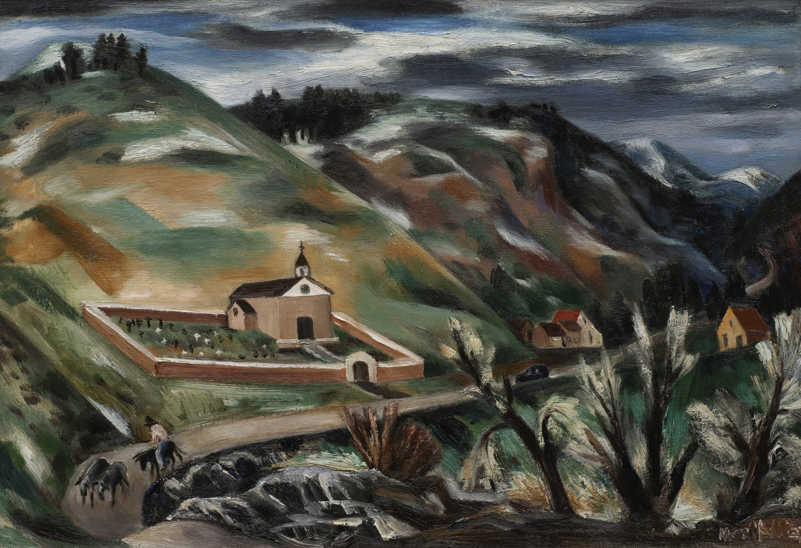 At the suggestion of William Penhallow Henderson (a classmate from his days at the Art Institute of Chicago), Nordfeldt visited Santa Fe after the end of World War I. He felt an immediate affinity for the people and landscapes of New Mexico and he was to live in the state off and on for the next twenty years. His New Mexico paintings, particularly his vibrant depictions of Pueblo ceremonial scenes, are distinctly modernist in composition and execution. The influence of Paul Cezanne is readily apparent in Nordfeldt's work, along with that of other pioneering New Mexico modernists, including Marsden Hartley, Andrew Dasburg, Ward Lockwood, and Jan Matulka.