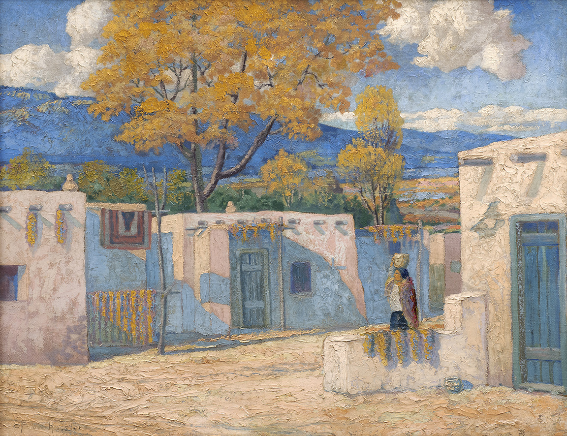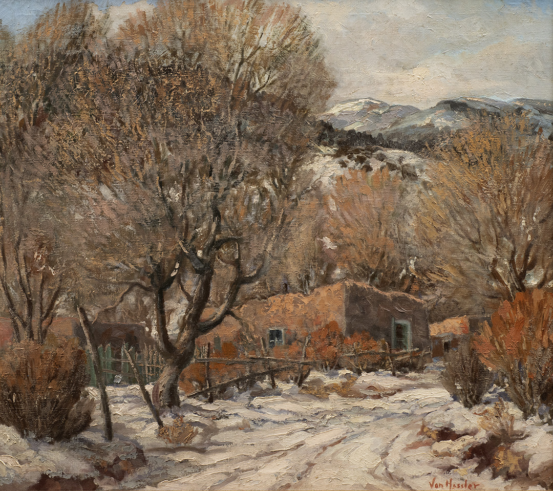 Carl Von Hassler was born in Bremen, Germany, of French and Dutch parents. He came to the United States in 1909, to live and study art in Greenwich Village for one year. After a short return to Germany, Von Hassler decided to immigrate to the United States. In 1920, he moved to New Mexico. He lived in Manuelitos, on the New Mexico-Arizona border, where he sketched and painted portraits of Native Americans. His interest in their culture was so strong that he explored all of the pueblos in the area and learned to speak Navajo. Von Hassler eventually settled in Albuquerque, where he painted the local landscape. He used all media in his work, including ink, watercolor, egg tempera, and oil. His preference was for plein air work, which stemmed from his great respect for nature. Typically, he would sketch on location and complete the painting in his studio.