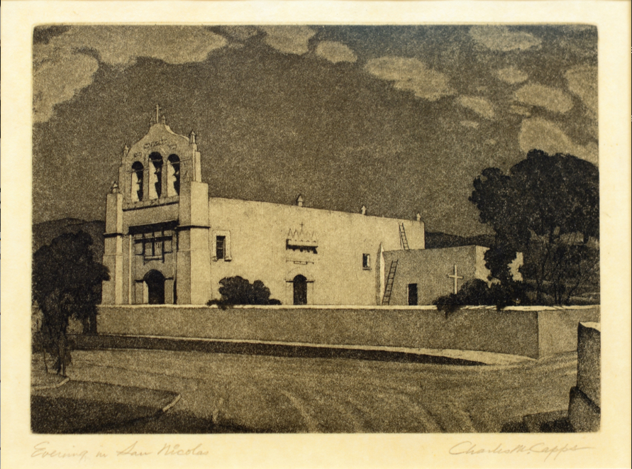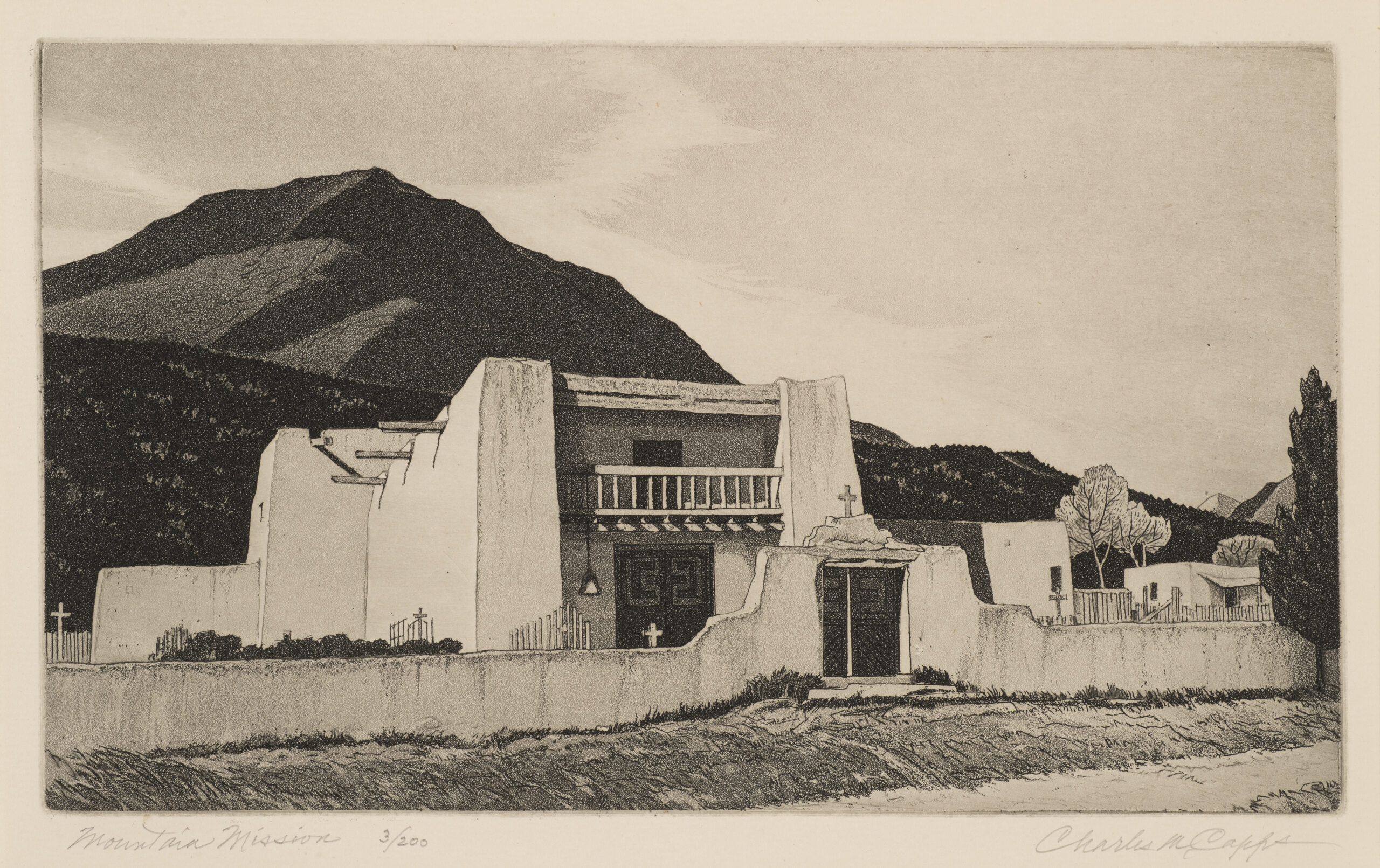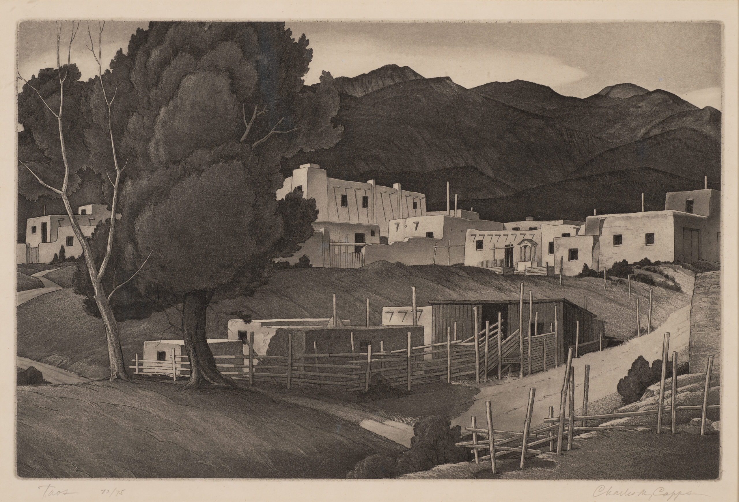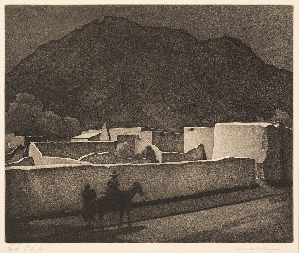 Charles Capps was an accomplished printmaker and a charter member of the Prairie Print Makers. A native of Jacksonville, Illinois, Capps moved to Wichita, Kansas, after studying at the Academy of Fine Arts in Chicago and the Pennsylvania Academy of Fine Arts. He created many images of Midwestern scenes and Southwestern subjects as well as commercial art illustrations. Travels brought him to New Mexico where he was struck by the adobe architecture of Taos and Santa Fe. Known for the exceptional quality of his works, Charles Capps created his own plates, then signed and numbered each print in pencil.