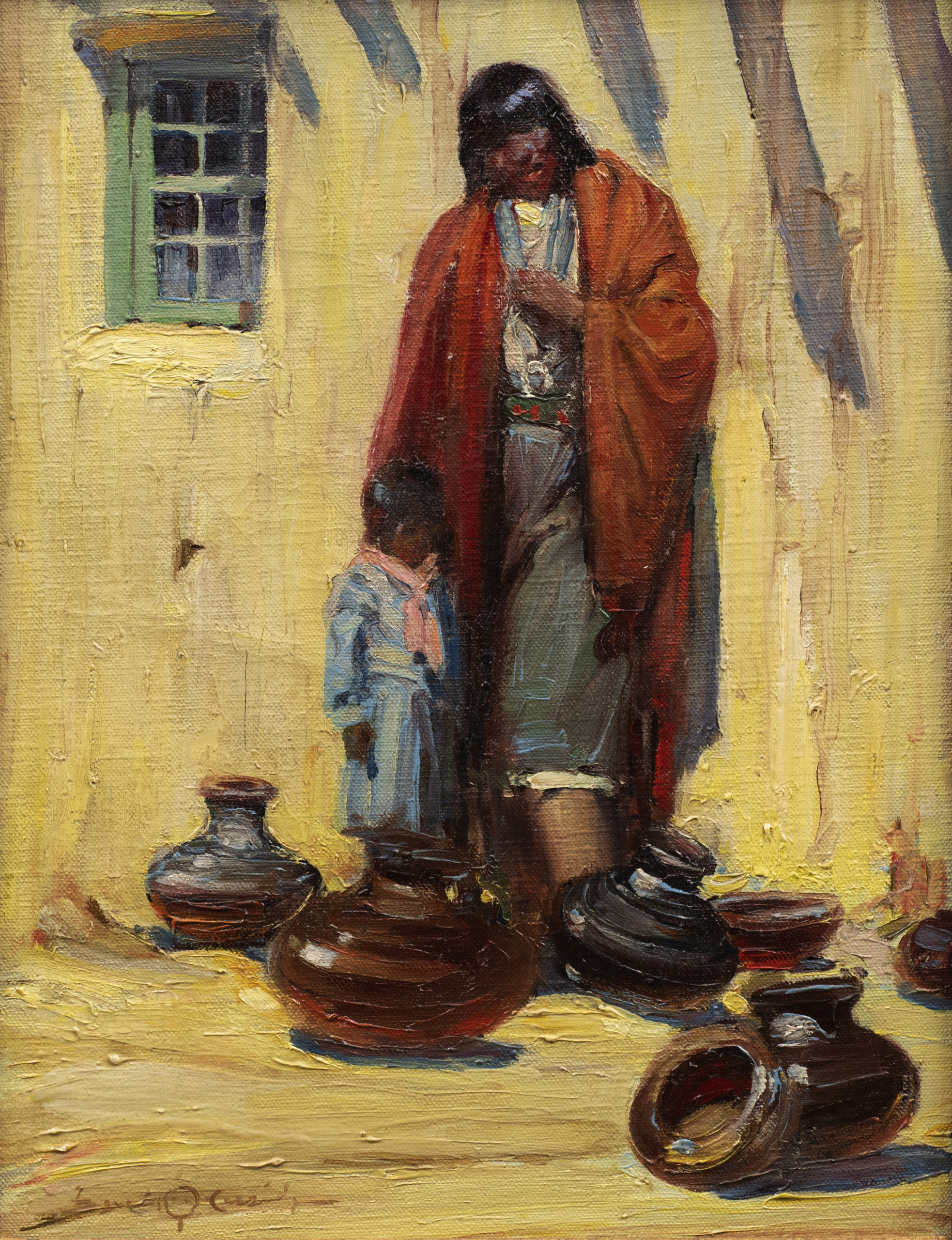 Son of a builder, Gerald Cassidy grew up in Cincinnati. He was the pupil of Frank Duveneck at the Institute of Mechanical Arts from a young age. By the time he was 20, he was art director for a New York City lithography studio. Stricken by pneumonia in 1899, he entered a sanitarium in Albuquerque where he created his first paintings in the Southwest. When he recovered sufficiently, he moved to Denver and began work as a commercial artist and lithographer. After returning briefly to New York City, he studied at the National Academy of Design and the Art Students League. He married Ina Sizer Davis and in 1912 the two settled in Santa Fe, following Carlos Vierra (1904) and Kenneth Chapman (1909). He was also active in Los Angeles, California from 1913-1921.