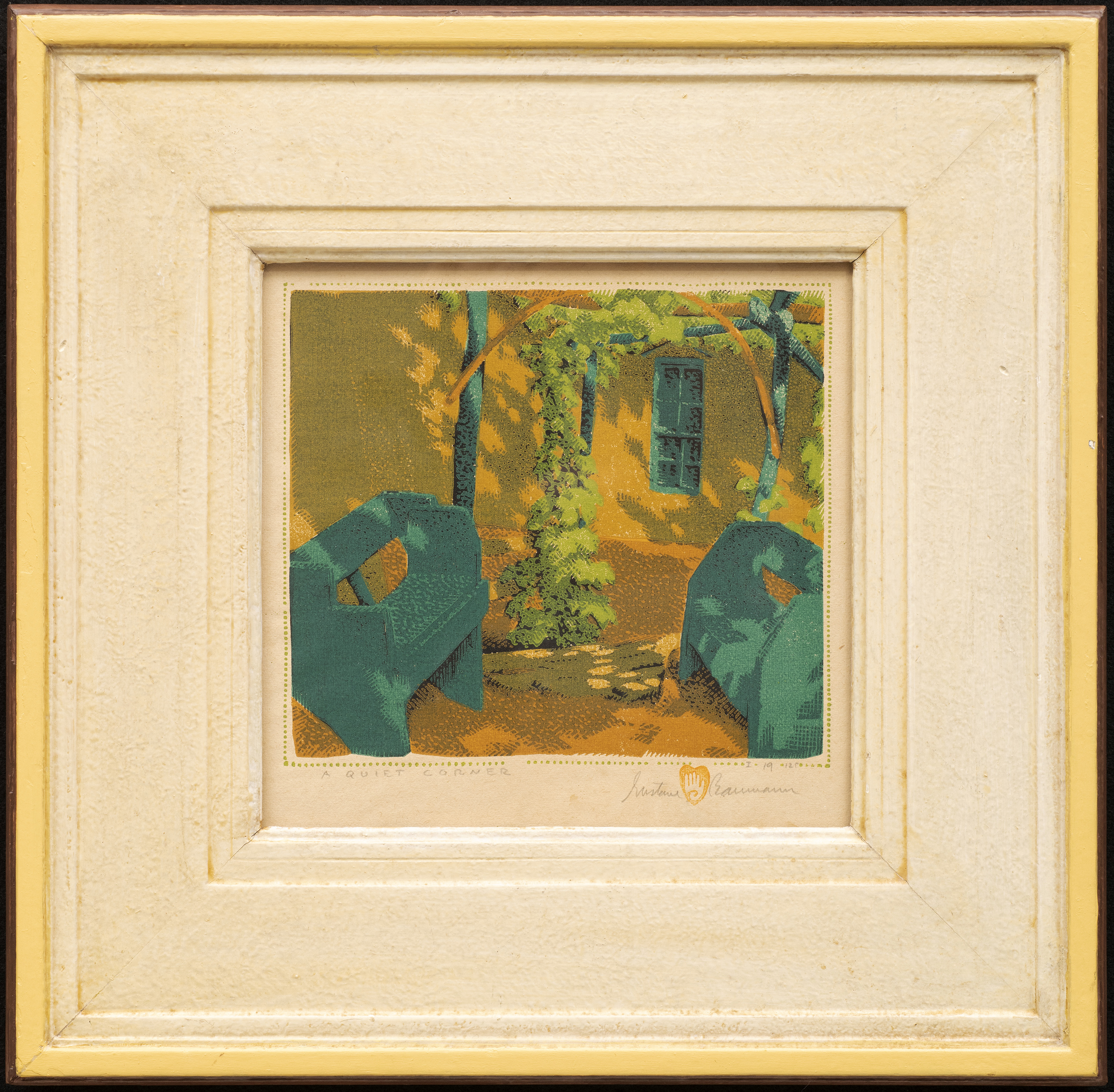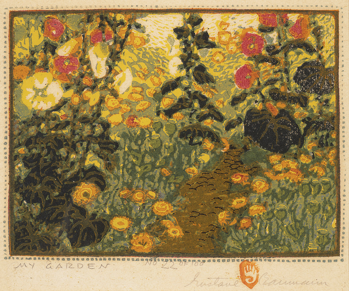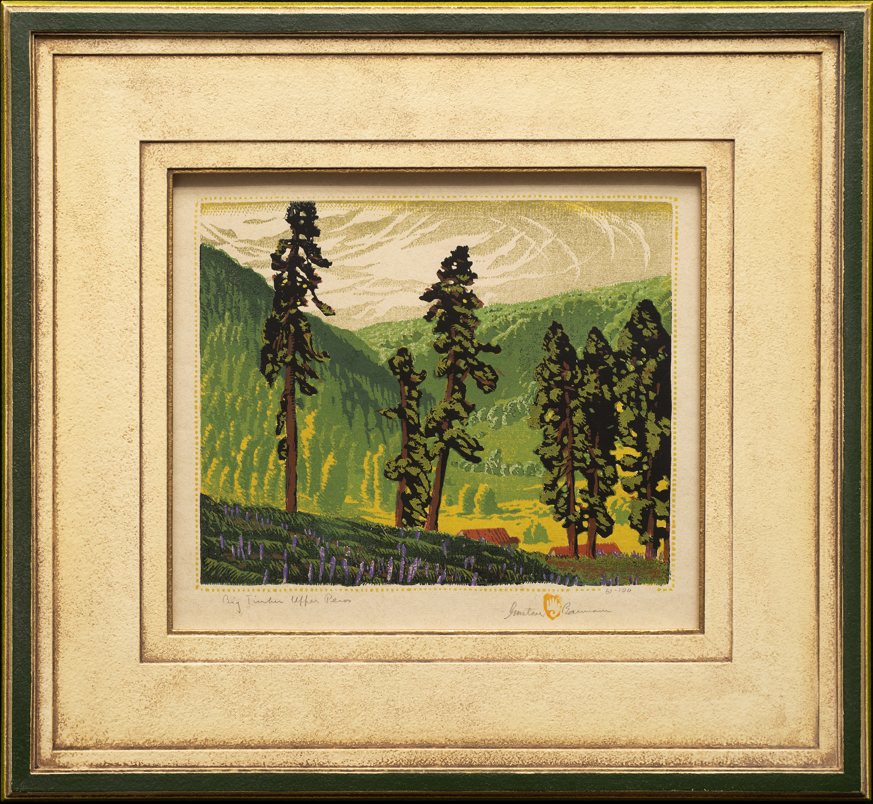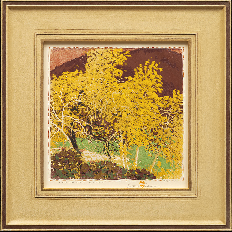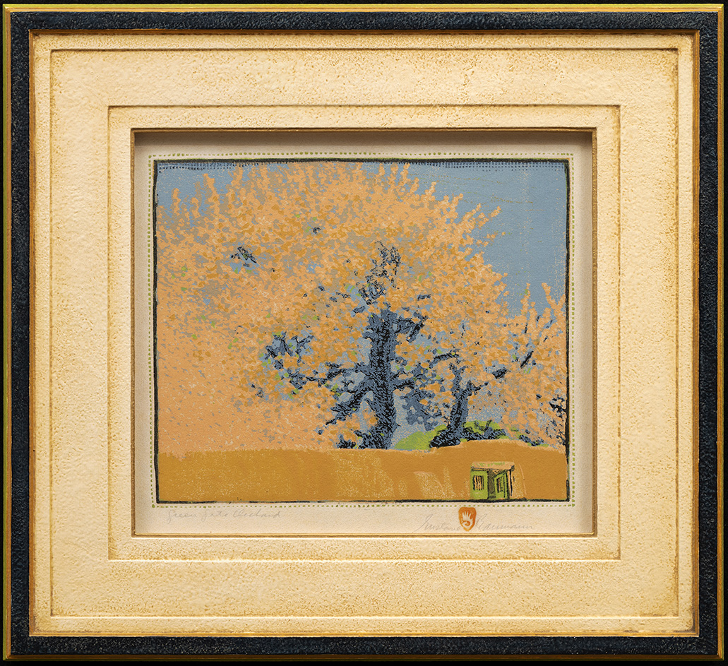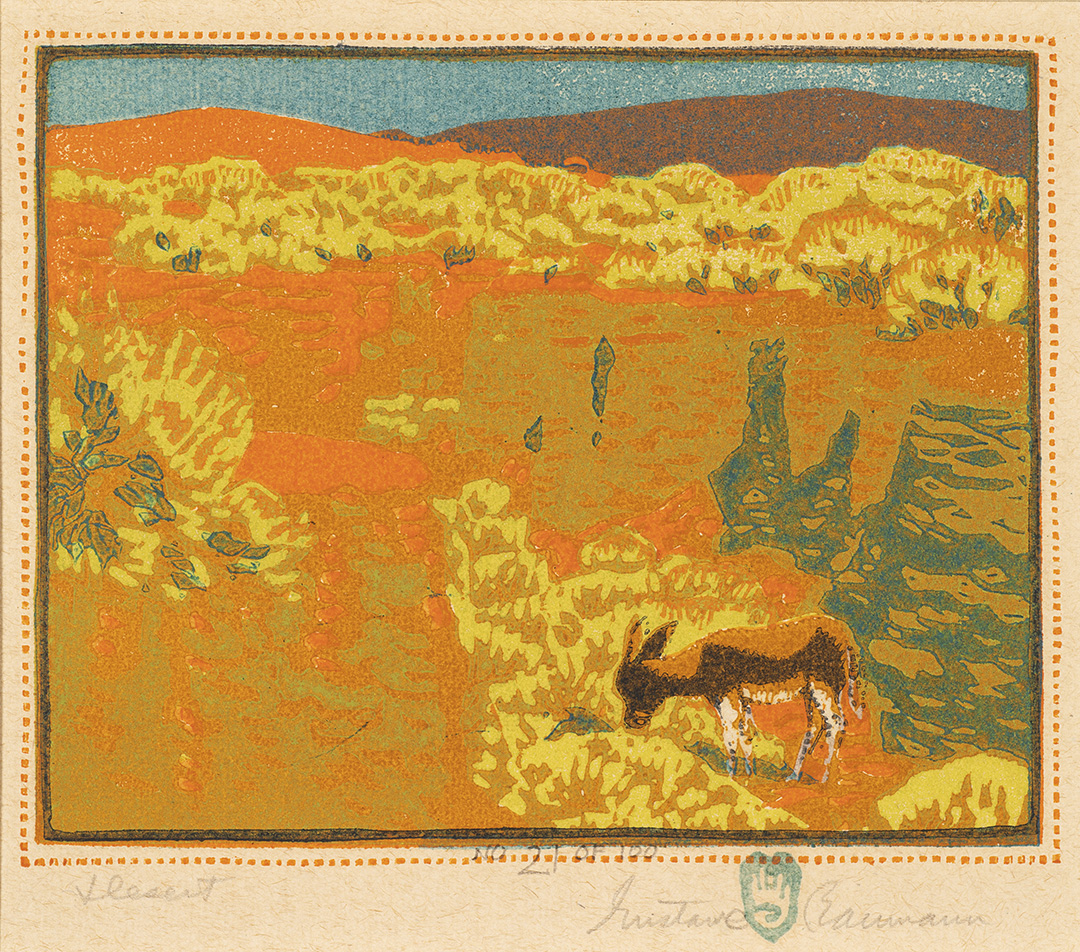 A master of the color woodcut, Gustave Baumann was born in Magdeburg, Germany, but moved with his family to Chicago at the age of 10. After study at the Art Institute of Chicago and work as a commercial artist, he returned to Germany in 1905 for a year's study in Munich. There he focused on the German technique of the woodblock print. Baumann returned to work in Chicago, later joining artist colonies in Brown County, Indiana, and Provincetown, Massachusetts. Upon winning the Gold Medal for printmaking at the 1915 Panama Pacific International Exposition in San Francisco, Baumann was asked to organize the first exhibition of American woodcut prints for the Art Institute of Chicago. In 1918, Baumann visited his artist friends in Taos and planned a quick visit to Santa Fe where an exhibition of his prints was being held at the newly-opened New Mexico Museum of Art. As a result of this visit, he decided to move permanently to Santa Fe.