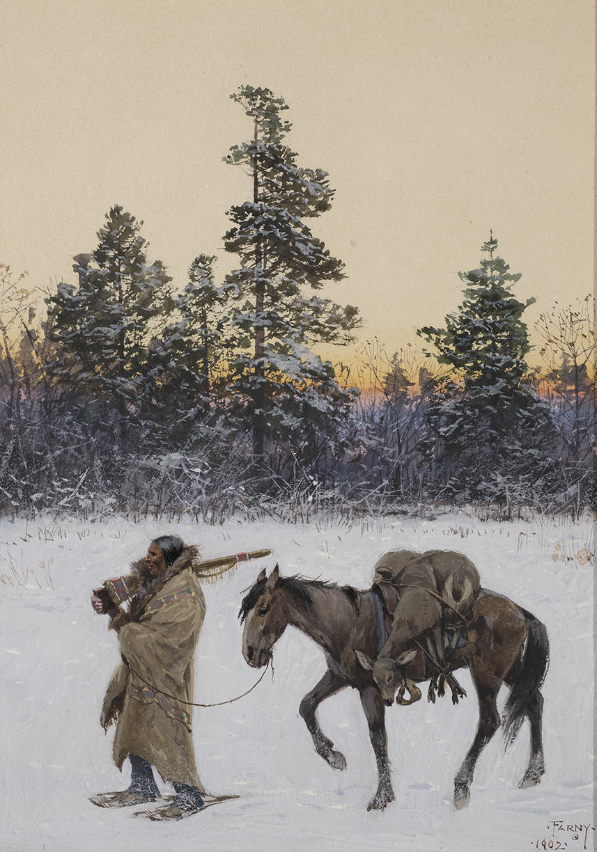 Noticing that there was an appetite for paintings depicting Native American life, Farny traveled west, making repeated trips to sketch, to take photographs, and to collect artifacts, noting that “The plains, the buttes, the whole country and its people are fuller of material for the artist than any country in Europe.” His oeuvre included around a hundred paintings of Native American subjects in which his sympathies for what famed photographer Edward S. Curtis called the “vanishing race” were evident.