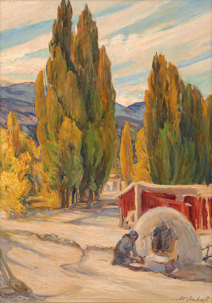 Imhof is best known for a series paintings called “Kivas and Corn,” which focused on the importance of corn in the culture of the Pueblo Indians. He built a studio in Albuquerque, in 1906, and traveled throughout the region, finally settling in Taos in 1929. Imhof collected many Indian artifacts and recorded ethnological information with his paintbrush. He had the first lithography press in Taos, making prints that are of ethnological value, and he also taught lithography.