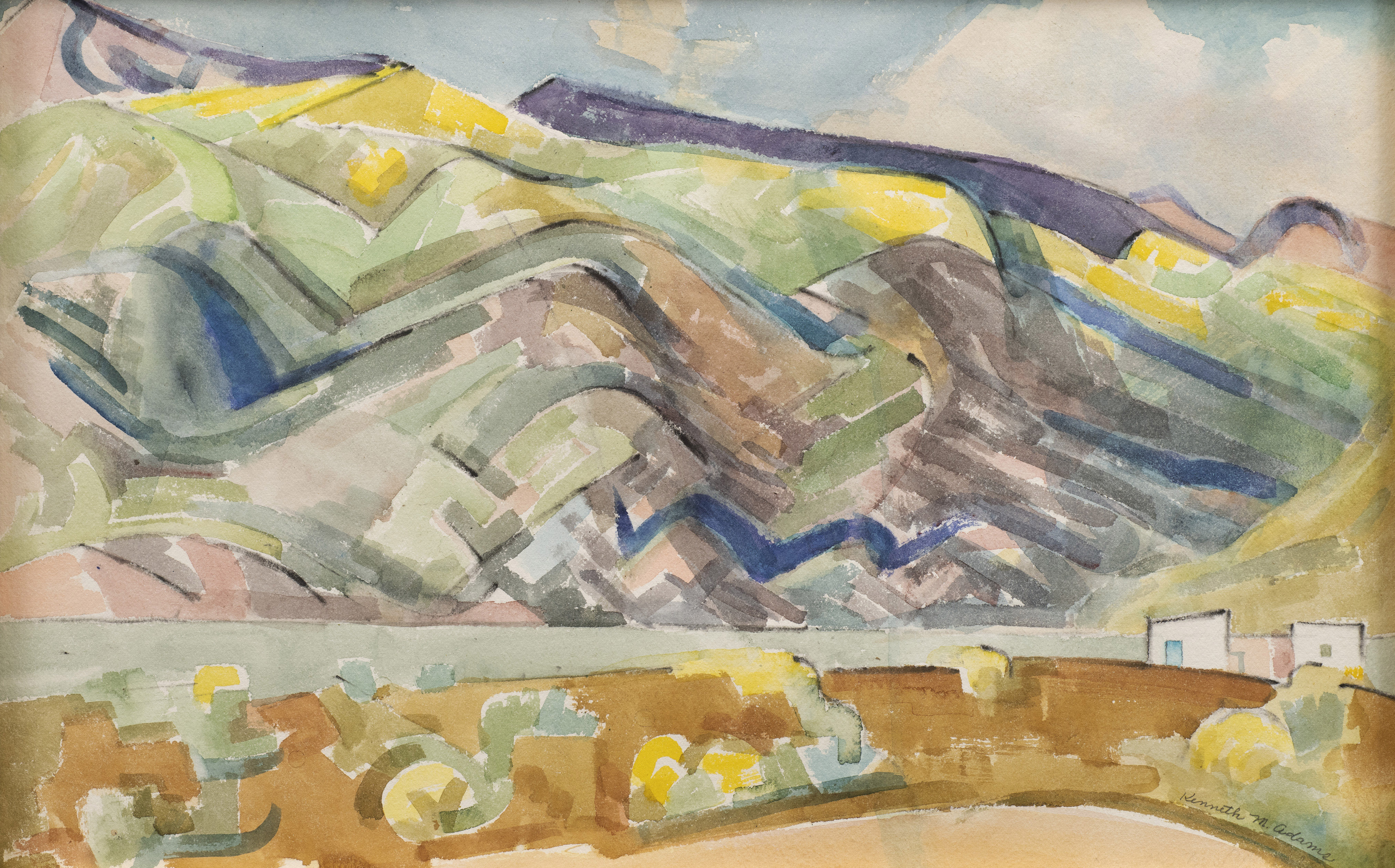 In contrast to the Taos artists, whose work was rooted in late nineteenth century academic principles, Adams was influenced by the Cubist style of Paul Cezanne and Taos artist, Andrew Dasburg. During the Depression-era 1930s, Adams worked for the U.S. Treasury’s Public Works of Art Program, creating murals for post offices in Kansas and New Mexico. On receiving a 1938 Carnegies Corporation grant, Adams moved to Albuquerque, where he became the first Artist-in- Residence at the University of New Mexico. He later became an instructor at the University, where he taught until 1963. In 1961, he was elected to the National Academy of Design.