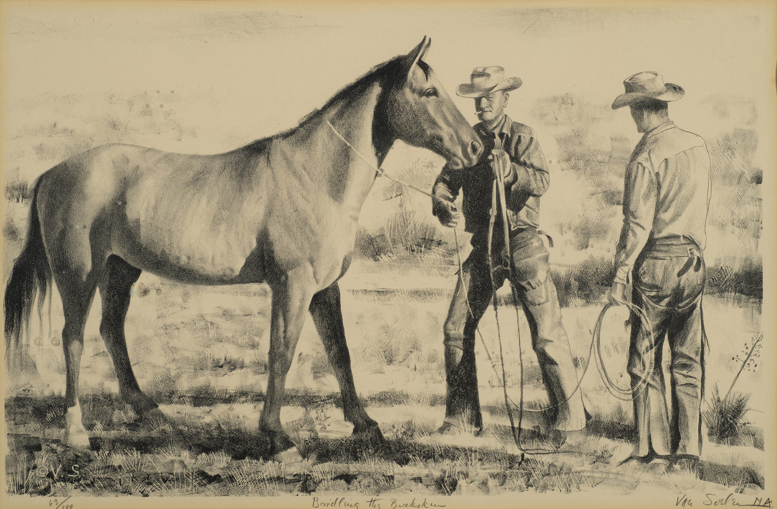 Born in St. Paul, Minnesota, Theodore Van Soelen had already become a well-educated and successful artist when he moved to New Mexico in 1916. He was especially famous for his expressive portraits, his stirring renditions of cowboy life, and his dramatic Western landscapes. He worked in oils and, after 1948, became a highly skilled lithographer. In 1922, Van Soelen became a member of the Santa Fe Art Colony, which was just then entering its heyday. Like many of his artist friends, during the Depression Van Soelen painted murals in New Mexican public buildings for the Works Progress Administration.