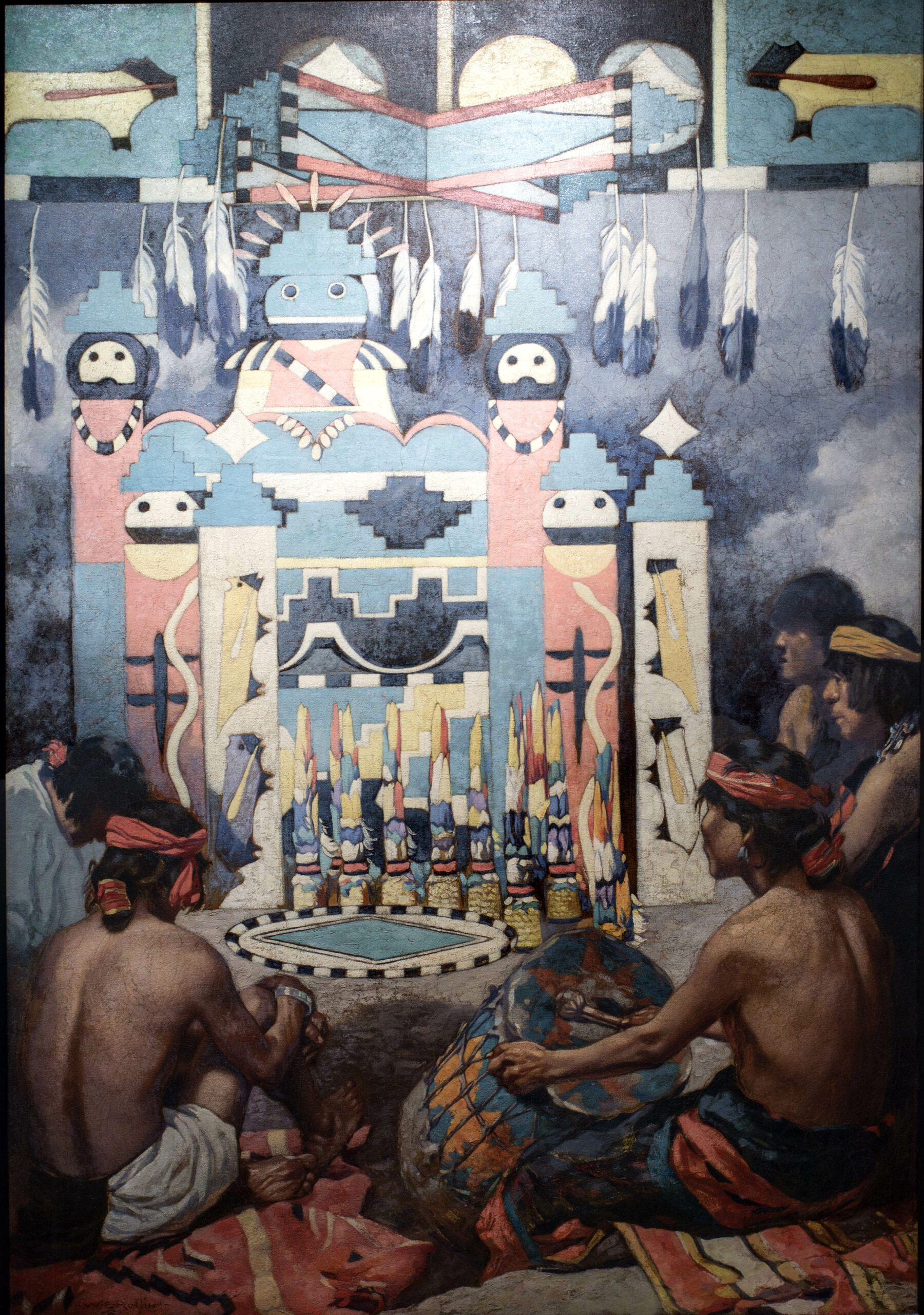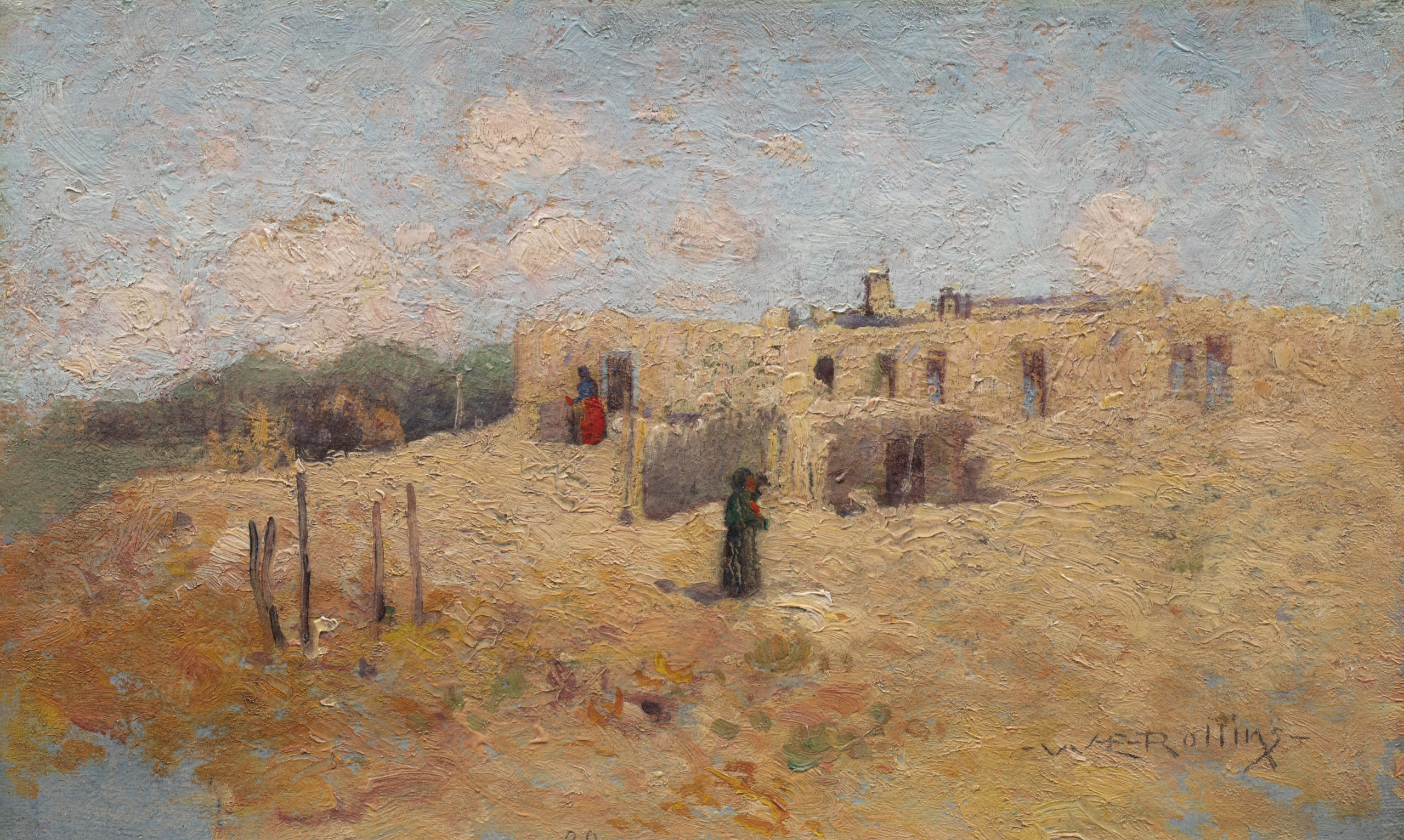 That same year, Rollins began the first of many sketching expeditions from a studio at the Hubbell Trading Post in Ganado, Arizona. He painted the everyday events and sacred ceremonies of the Hopi tribe, and Pueblos such as Zuni, Acoma, and Laguna. Rollins was the first artist to hold an exhibition of his work in Santa Fe. The show opened in June of 1910 and was held at the Palace of the Governors. Rollins lived and taught in Santa Fe for about 12 years, beginning in 1919. Often called the "dean" of the Santa Fe school, Warren Rollins devoted his life to "painting the Indians of the Southwest from the inside out."