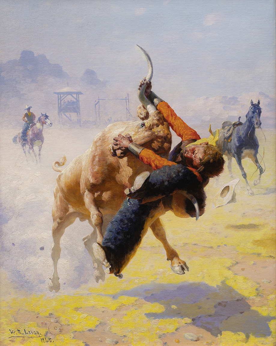 Leigh was born in West Virginia. From an early age, he longed to be an artist and his youthful works showed promise. When he was fourteen, he attended the Maryland Institute of Art in Baltimore and later enrolled at the Royal Academy of Art in Munich, Germany. In 1896, Leigh set up his studio in New York City and worked as an illustrator. After his first trip west in 1906, he returned repeatedly to pursue his favorite subjects: cowboys, Native Americans, outlaws, animals, and hunters. On each trip, he sketched hundreds of images, which he would later complete in his New York studio. Honors and accolades marked the last years of his life. Over time, W. R. Leigh, along with Frederic Remington and Charles M. Russell, came to be regarded as one of the three pioneers of American genre painting.