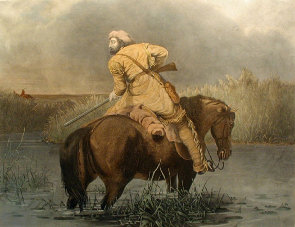 Born in Middletown, Connecticut, William Ranney devoted his career to depicting the West. As a young man, he apprenticed to a tinsmith in Fayetteville, North Carolina, having abandoned his study of art in New York City after the death of his sea captain father. To find adventure, in 1836 Ranney joined the Texas army in its fight for independence against Mexico. This brief period was his only experience on the frontier. It is likely that he met trappers on this venture, as several of his most popular paintings, including “The Trapper's Last Shot,” were based on a rowdy rendezvous with trapper Joseph Meek in Yellowstone Park.